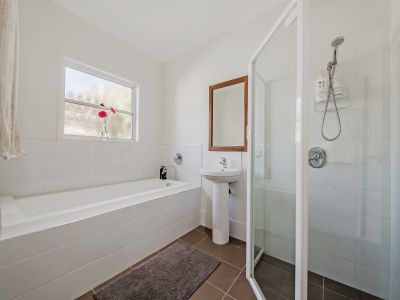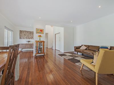 Downstairs offers a modern kitchen with solid timber benches and quality stainless steel appliances. The living and dining rooms open out to the front private garden and entertaining area, or the pool area to the side. There are 2 double bedrooms with built in robes, a family bathroom, separate toilet and laundry.